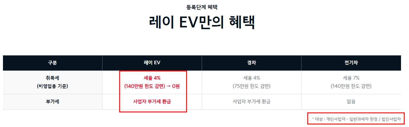 여기에 개인사업자 또는 법인사업자는 취득세 할인도 받을 수 있기 때문에 실속 있는 차량이기도 합니다. 레이EV의 각 옵션별 가격과 기본 품목은 아래와 같습니다.