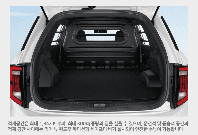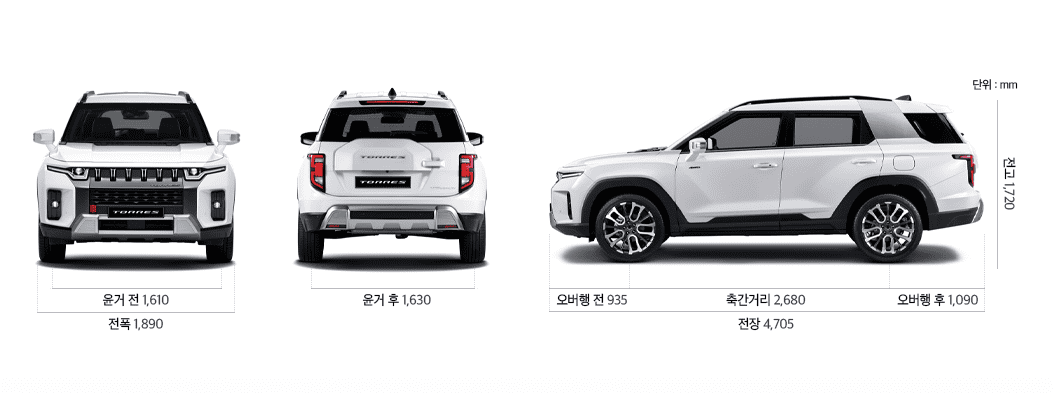 토레스가 투싼보다도 전장, 전폭 모두 크고 공간도 넓은 차량임을 알 수 있습니다. 물론 내부 공간은 현대와 기아가 잘 빼긴 하지만, 토레스도 꽤나 좋은 선택지임을 확실히 보여주고 있습니다.