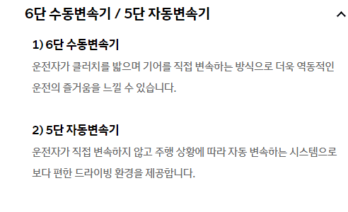 연비에 무게를 둔다면 6단 수동변속기를, 주행의 편함을 생각한다면 5단 자동변속기를 선택하면 됩니다. 그건 선택의 문제이니 더 선호하는 변속기를 선택하면 됩니다.