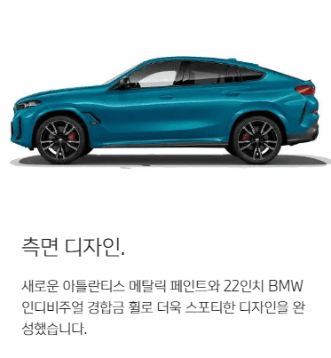 마지막으로 bmw x6 디자인을 감상하도록 하겠습니다. 진짜 멋있는 것 같습니다. 제가 bmw 차량 모델들에 그리 큰 관심이 있는 편은 아닌데 x6 모델은 진짜 다른 것 같습니다.